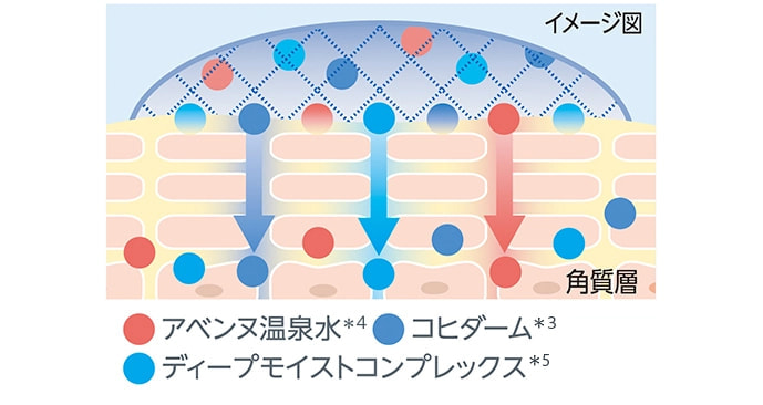 メッシュのようなヴェールが、ヒアルロン酸などのうるおい成分とアベンヌ温泉水*4を抱え込み持続的にリリースすることで、肌のすみずみまでムラなく浸透*2し、うるおいを届けます。