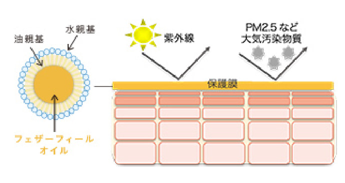 紫外線防止剤を溶け込ませたフェザーフィールオイルを、水になじみやすいよう乳化させる独自技術を採用。